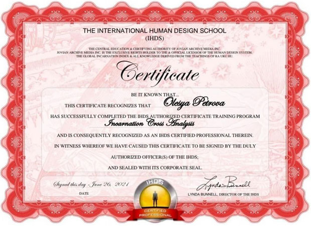 Это официальные сертификаты Международной школы, подтверждающие право преподавания и консультирования. Сертификация IHDS - это годы обучения и экзамены, которые проходят единицы.